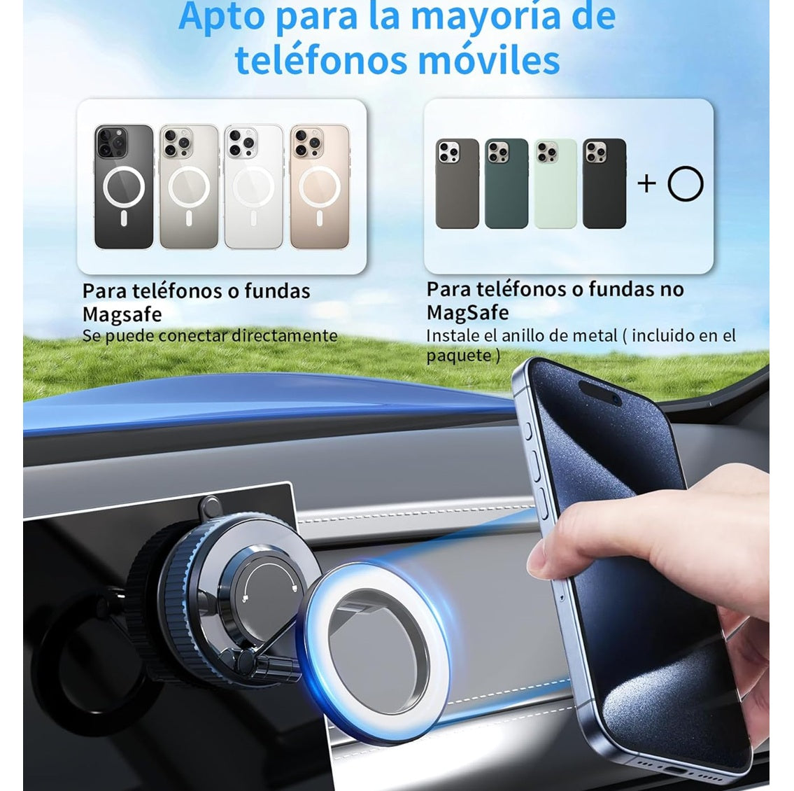 Sí. Funciona con la mayoría de fundas delgadas o medias. Para fundas muy gruesas o de materiales no metálicos, es recomendable usar la placa magnética incluida para asegurar una sujeción firme.