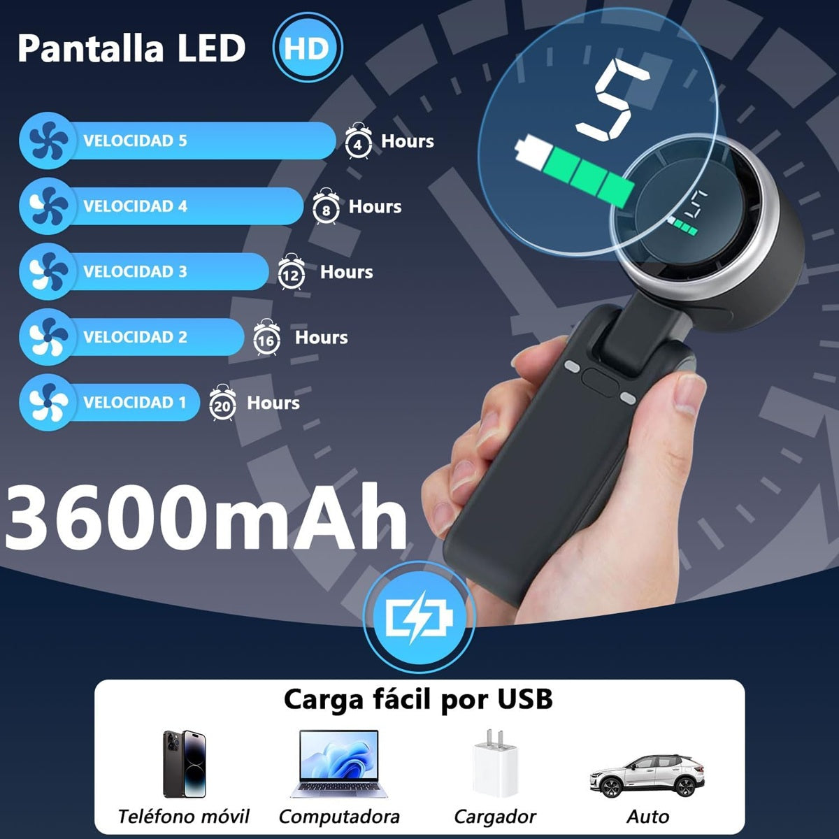 La batería recargable ofrece varias horas de funcionamiento continuo dependiendo del nivel de velocidad seleccionado. Es perfecta para uso diario, viajes, actividades al aire libre o jornadas de trabajo prolongadas.
